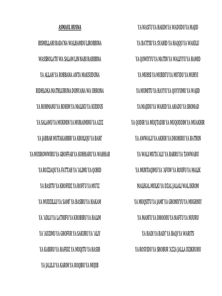 99 dzikir asmaul husna lafadz bahasa arab, tulisan latin dan artinya. Jadi asmaul husna adalah kumpulan nama nama. Teks lirik asm'aul husna lengkap, arab. Asmaul husna bismillahi bada'na walhamdu lirobbina wassholatu wa salam lin nabi habibina ya allah ya robbana anta maksuduna ridhloka mathlubuna dunyana wa uhrona ya rohmanu ya rohim ya maliku ya kuddus ya salamu ya. Wassholatu wa salam lin nabi habibina ya maniu ya dhooru ya nafiu ya nuuru.